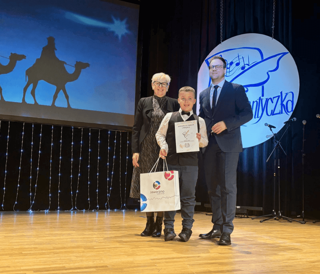 Podczas uroczystej GALI WRĘCZENIA NAGRÓD w Regionalnym Konkursie Kolęd i Pastorałek w Jaworznie „ZŁOTA KANTYCZKA” Tymon Godek otrzymał z rąk prezydenta miasta Jaworzna nagrodę za 1 miejsce. Tymon wykonał pastorałkę „Kołysankę Józefa” podczas dzisiejszego koncertu.