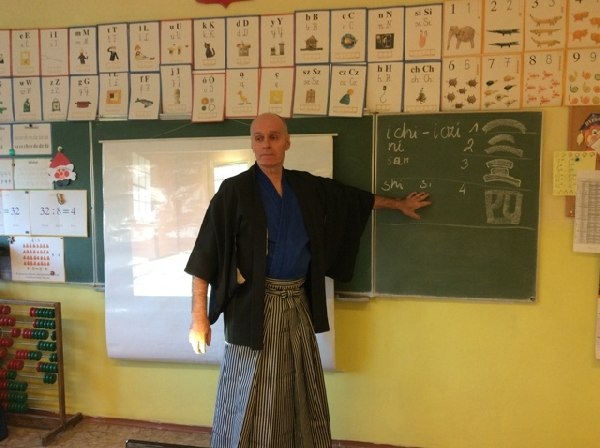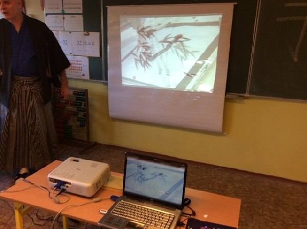 Sensei  S. Magdziak prezentował ciekawe slajdy i uczył dzieci z wielkim sukcesem pisania słów po japońsku.