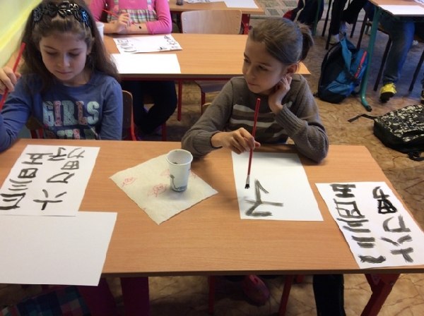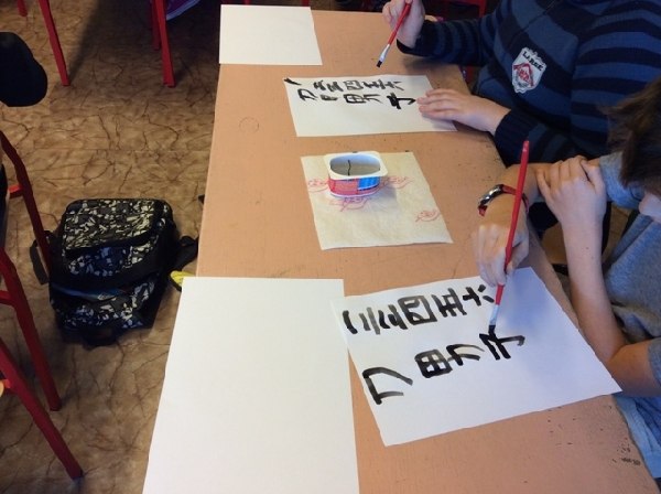W ramach spotkań z ciekawymi ludźmi w klasach III b wych.  pani E. Magdziak i II b wych. pani Joanna Pełka odbyły się interesujące zajęcia pt.  „Zabawa z pędzelkiem i czarną farbą – kaligrafia japońska”.