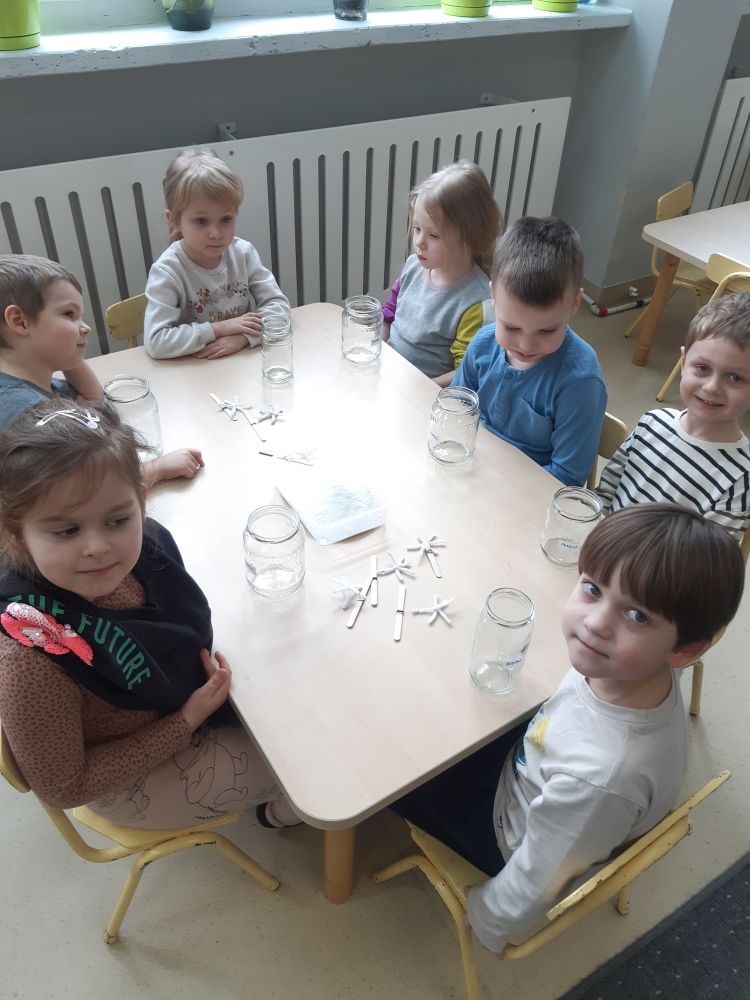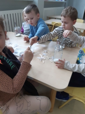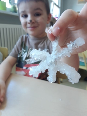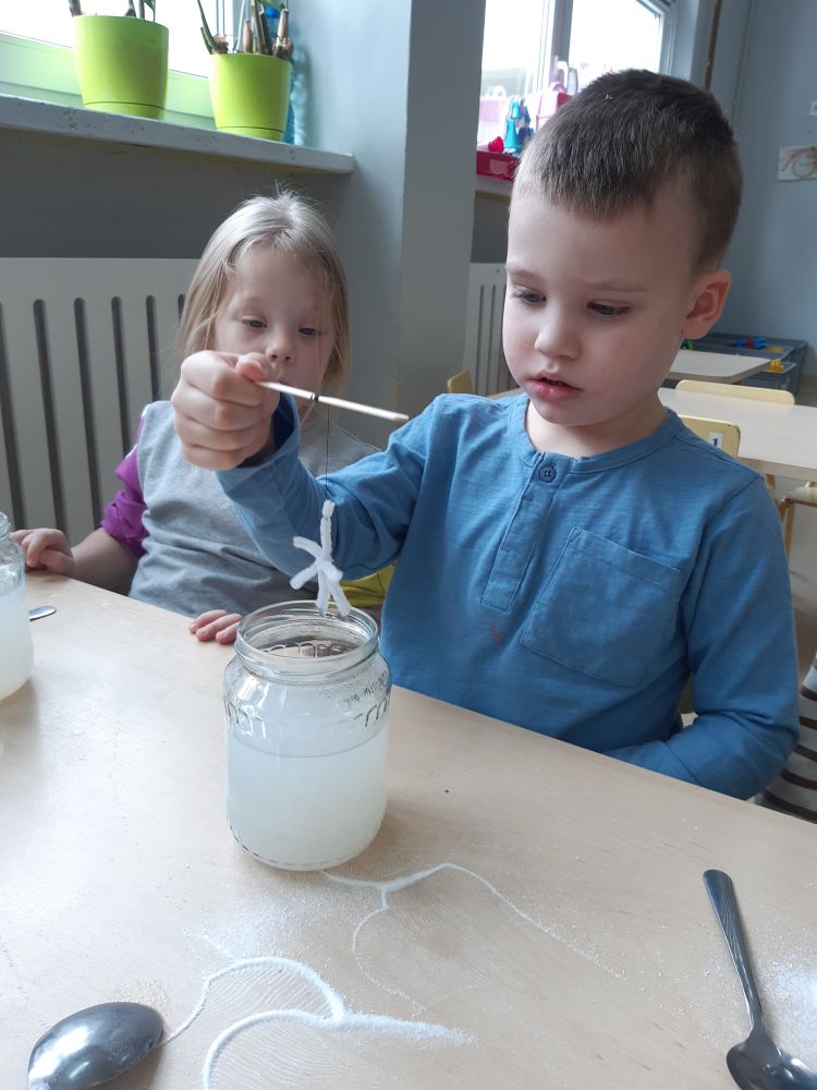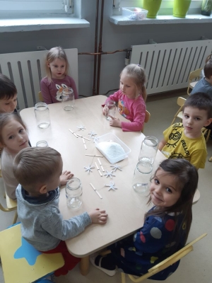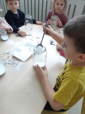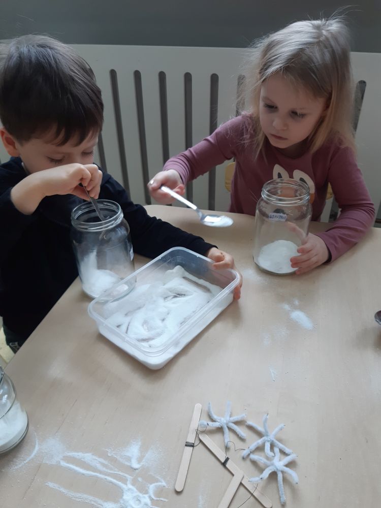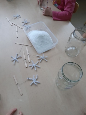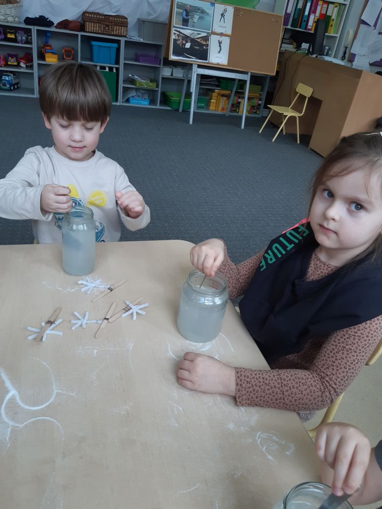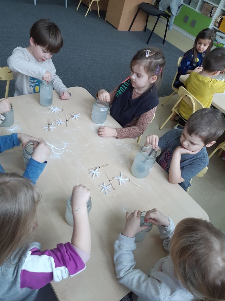 W pierwszej kolejności dzieci przygotowały stanowiska pracy, następnie samodzielnie wykonały z drucików kreatywnych śnieżynki. Kolejnym etapem było wsypanie sporej ilości proszku do słoika oraz wlanie przez nauczyciela gorącej wody. Dzieciaki rozmieszały bardzo dokładnie proszek w wodzie.  Następnie śnieżynki zostały włożone do gotowej substancji. Każdy musiał sprawdzić czy śnieżynki nie dotykają ścianek naczynia z żadnej strony.