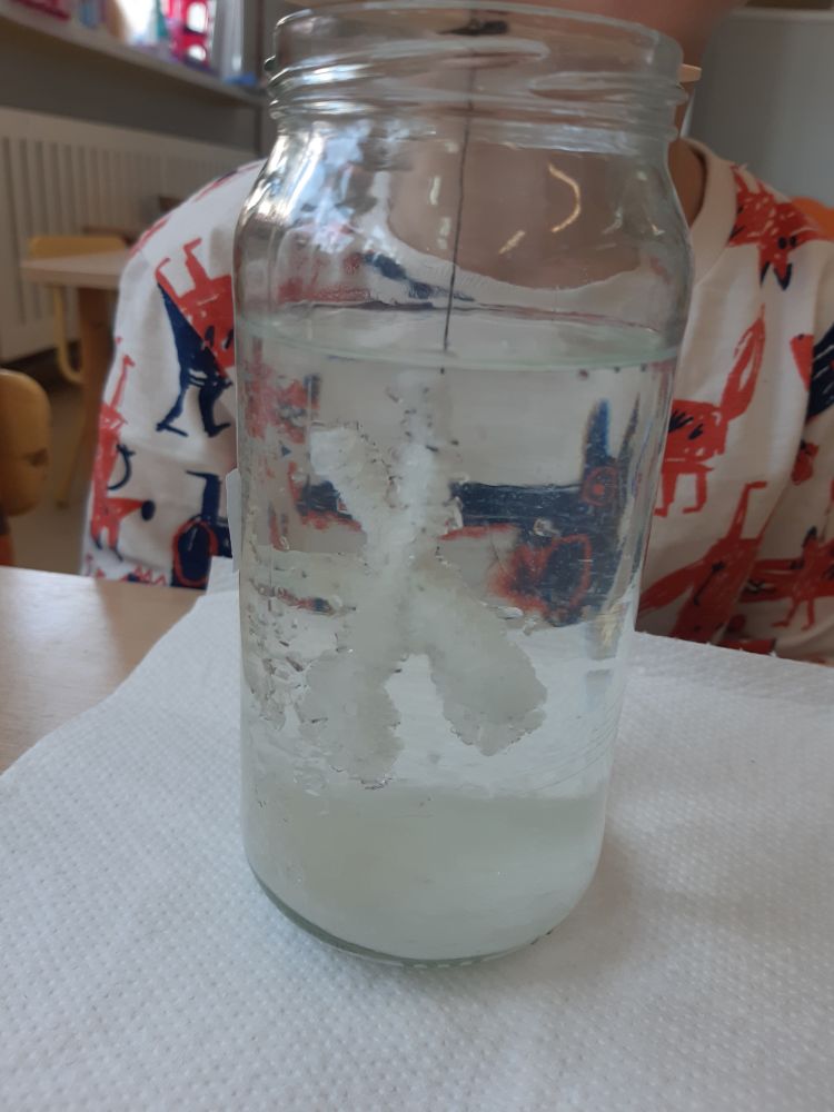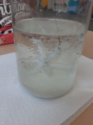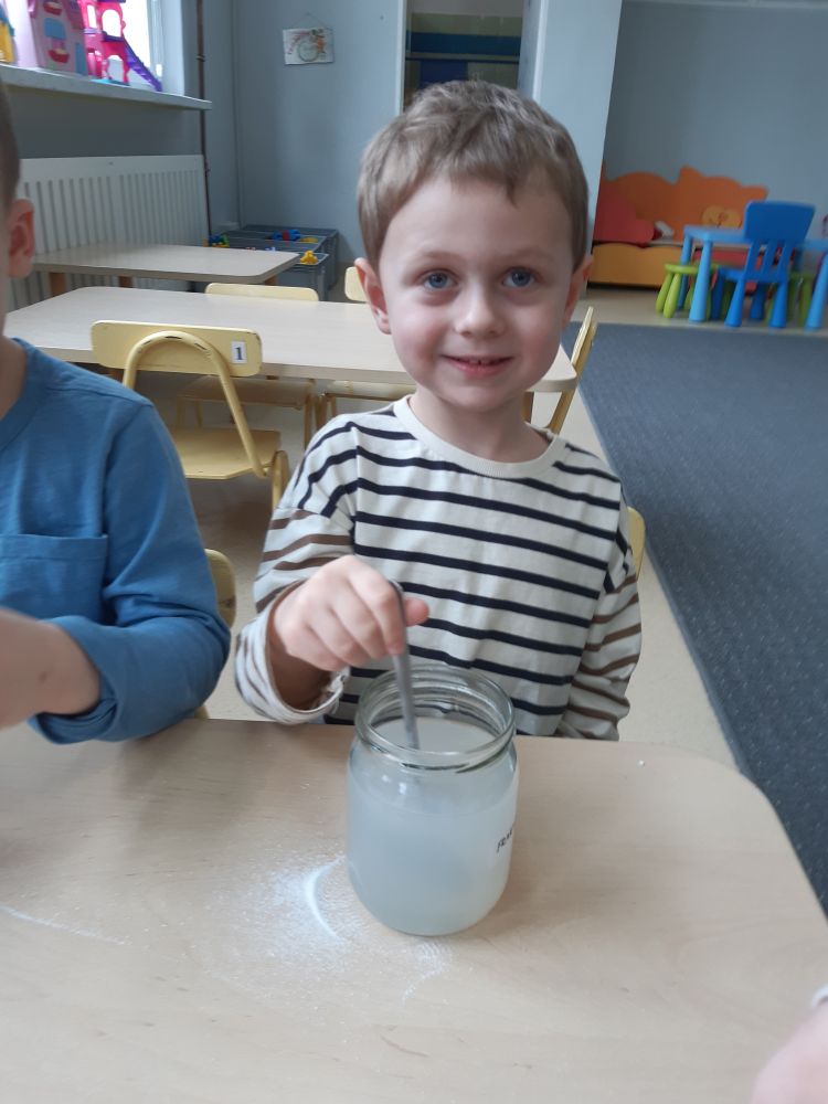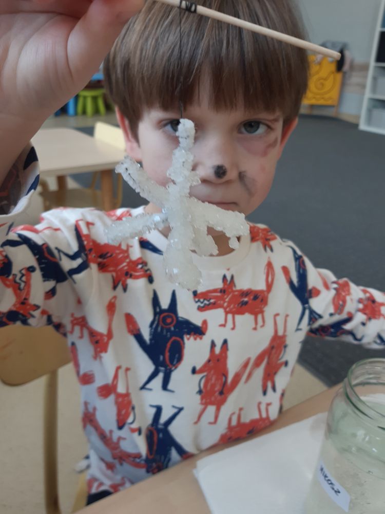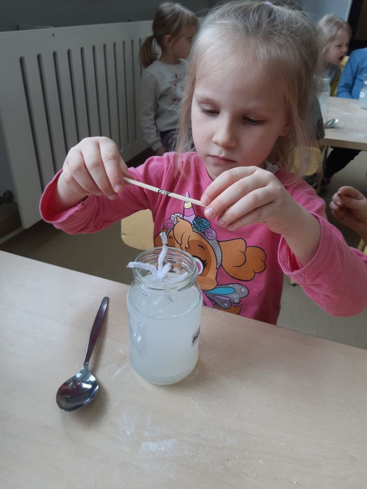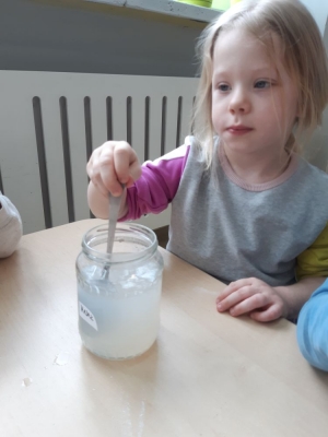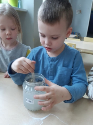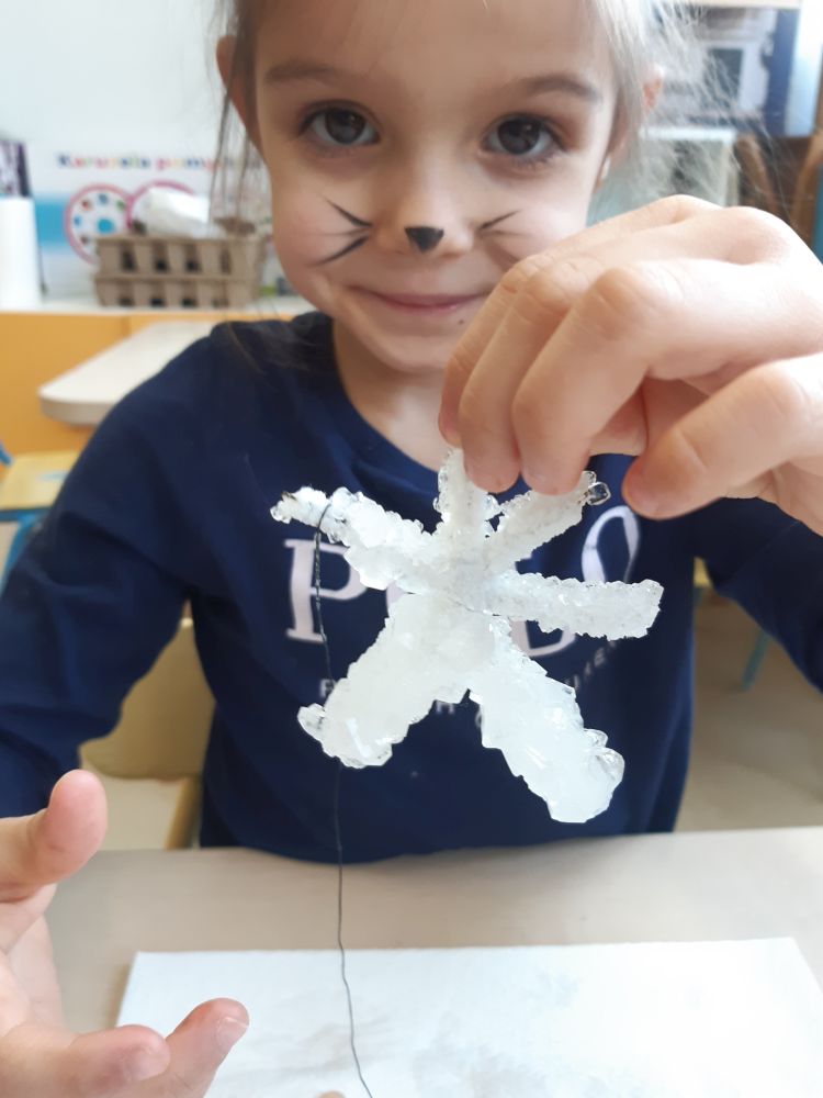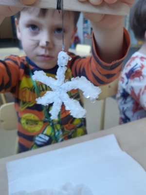W pierwszej kolejności dzieci przygotowały stanowiska pracy, następnie samodzielnie wykonały z drucików kreatywnych śnieżynki. Kolejnym etapem było wsypanie sporej ilości proszku do słoika oraz wlanie przez nauczyciela gorącej wody. Dzieciaki rozmieszały bardzo dokładnie proszek w wodzie.  Następnie śnieżynki zostały włożone do gotowej substancji. Każdy musiał sprawdzić czy śnieżynki nie dotykają ścianek naczynia z żadnej strony.