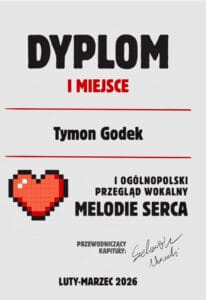 Ogólnopolski przegląd wokalny przez Piotrek · 18 kwietnia 2026 · odsłon: 4 Tymon GODEK z klasy 4b zdobył I miejsce w OGÓLNOPOLSKIM PRZEGLĄDZIE WOKALNYM „MELODIE SERCA”. Tymon zaśpiewał piosenkę Lady Gagi „I’LL NEVER LOVE AGAIN”. Tymona przygotowała pani Marzena Szydło Udostępnij na Facebook Messenger
