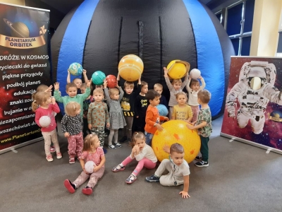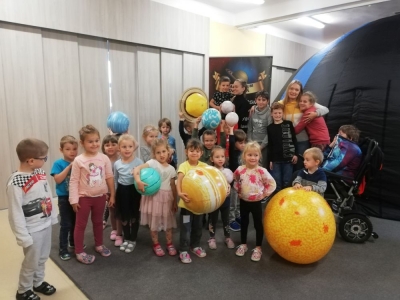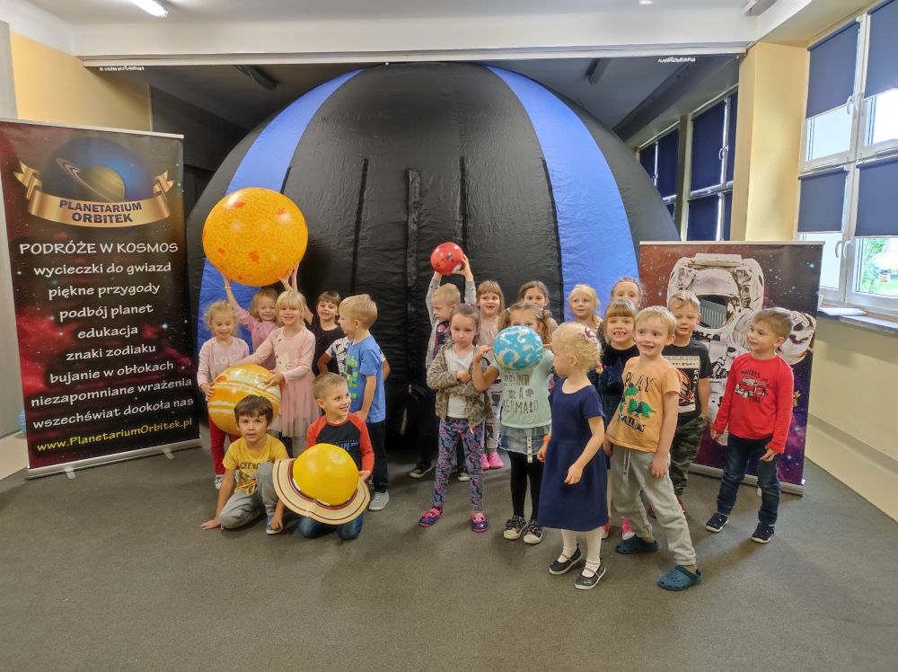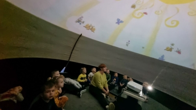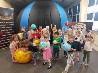 Gdy już wszyscy mieli najlepsze nastroje, dzieci ochoczo weszły do kopuły planetarium w przedszkolu i wyczekiwały na niesamowitą „bajkę”