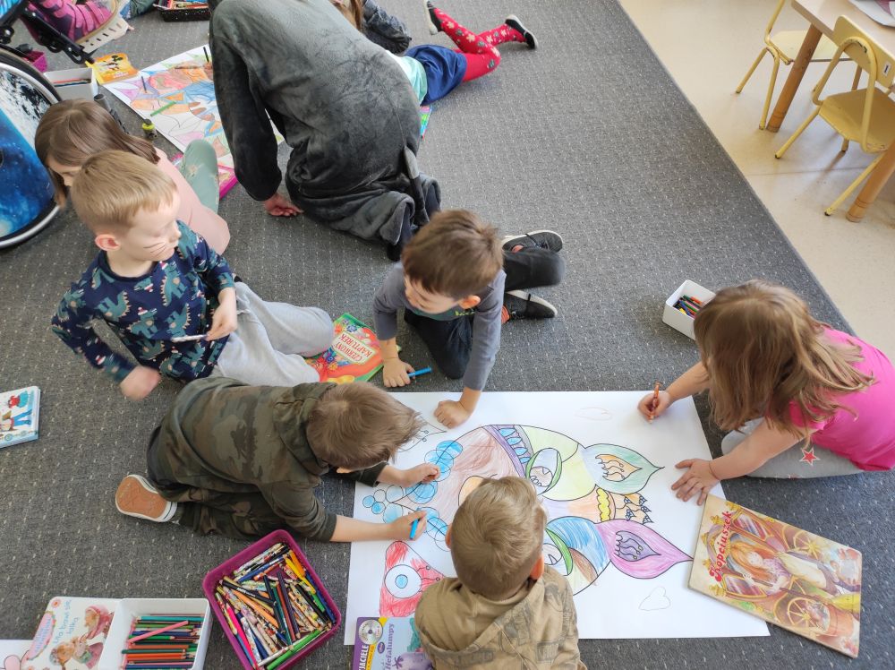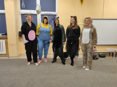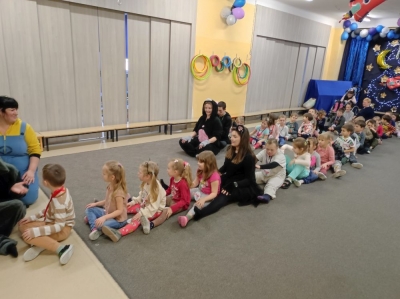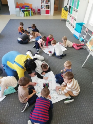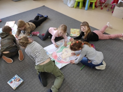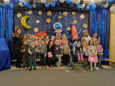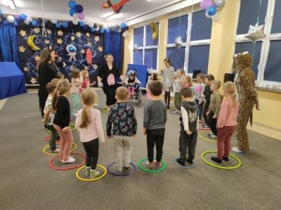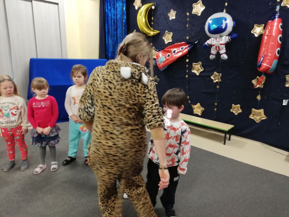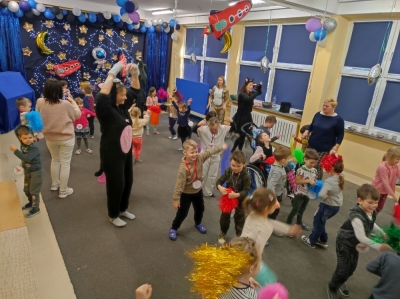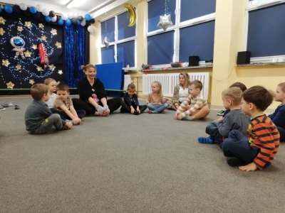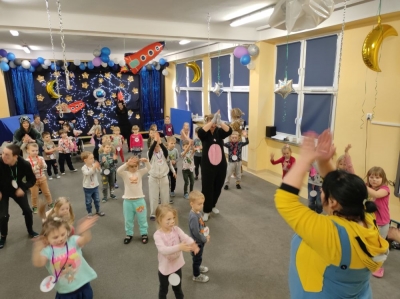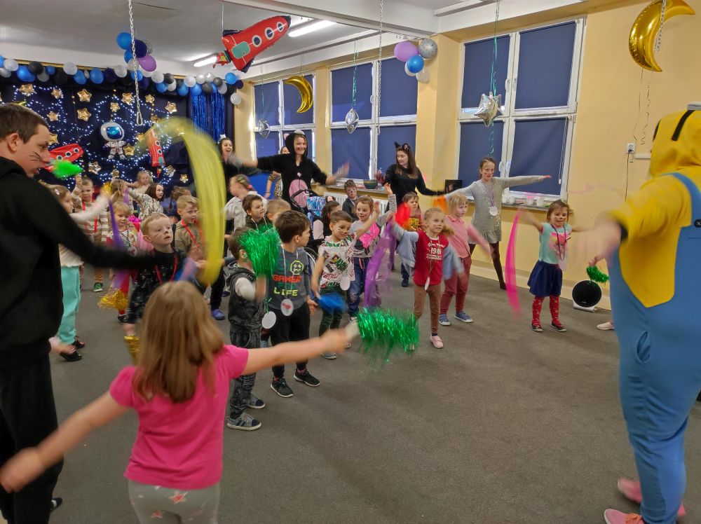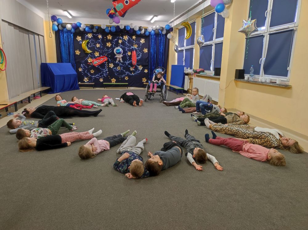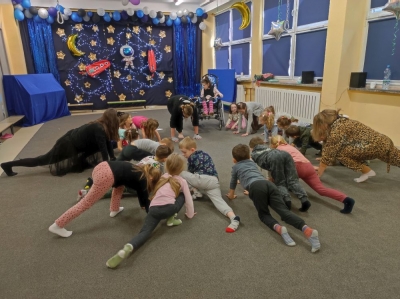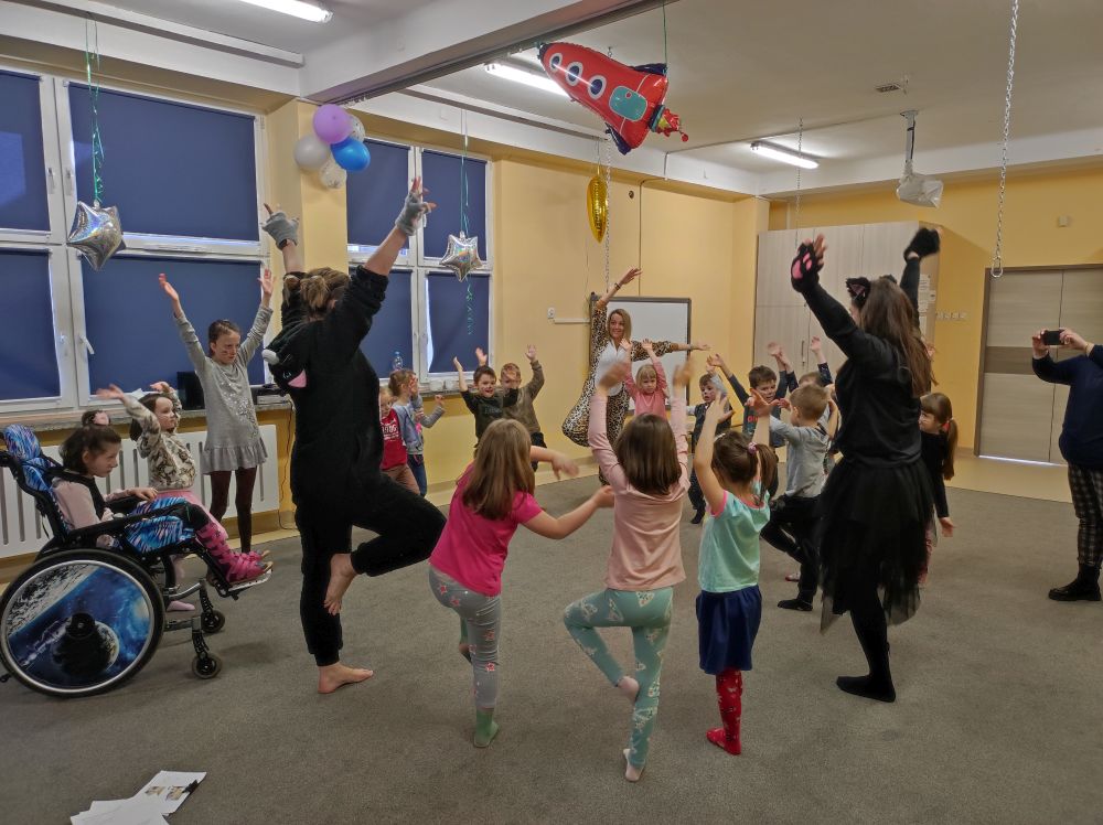 W lutym nasze przedszkolaki razem z uczniami ZSS nr 4 wybrali się w podróż na planetę „Kotayoga”. Aby przygotować się do tej kosmicznej podróży należało zrobić rozgrzewkę. Dzieciaki jak zawsze energicznie i z wielkim zaangażowaniem wykonywały wszystkie ćwiczenia, nawet najtrudniejsze pozycje zaproponowane przez joginkę kotkę Magdę. Po warsztatach jogi, nadszedł czas na warsztaty plastyczne i odczarowywanie bezbarwnych i smutnych mieszkańców „Kotayogi”. Następnie dzieci szalały przy muzyce w trakcie warsztatów zumby. Mimo, iż spotkanie już się zakończyło to  dalej wspominamy dzikie harce i wspólne zadania i z niecierpliwością czekamy na następne spotkania.