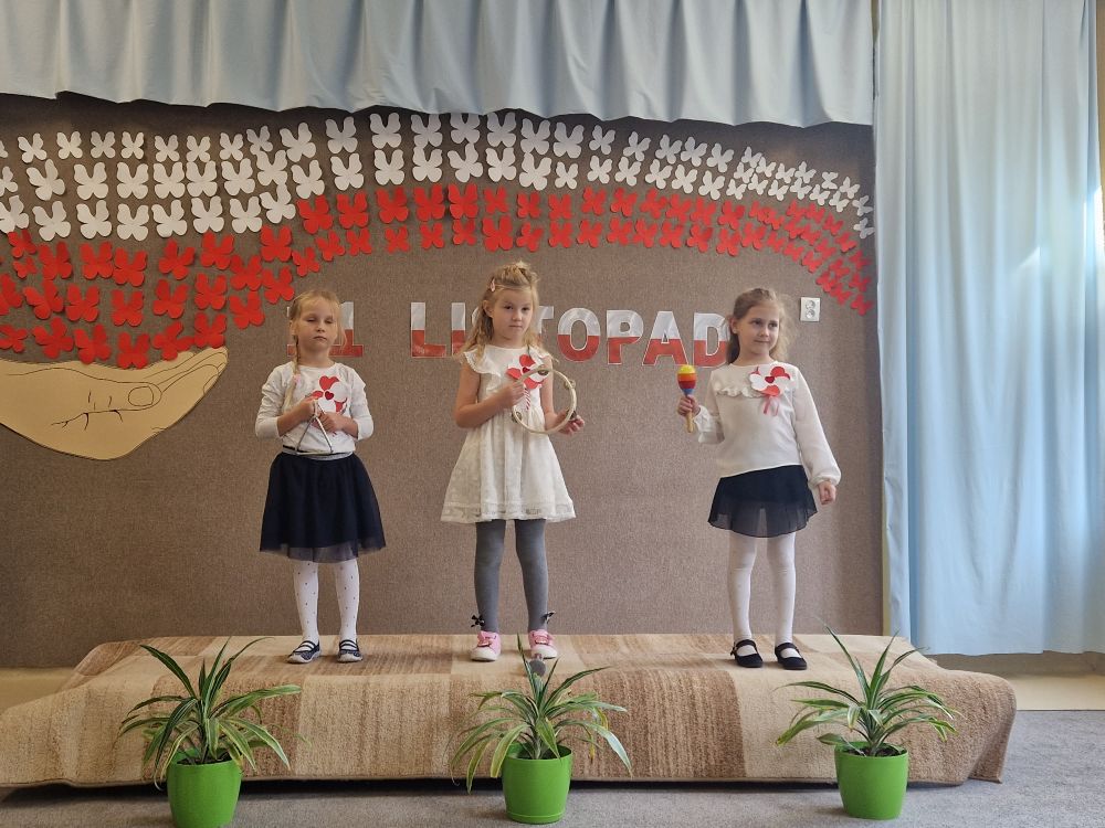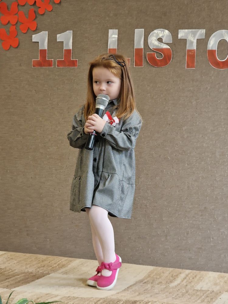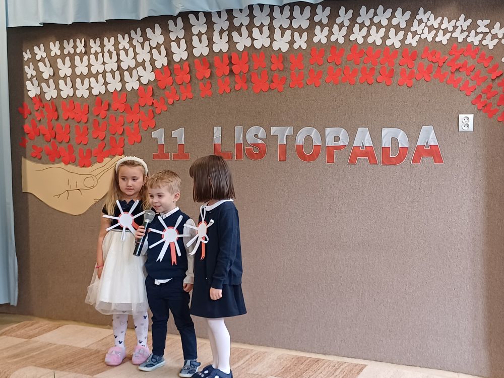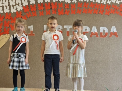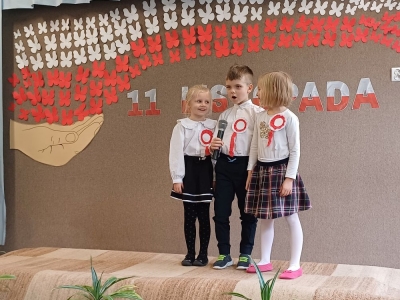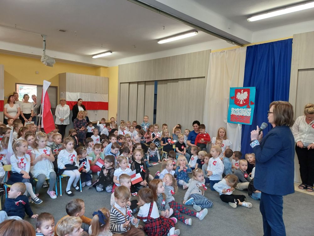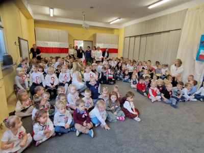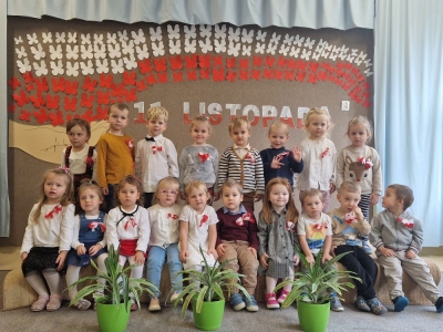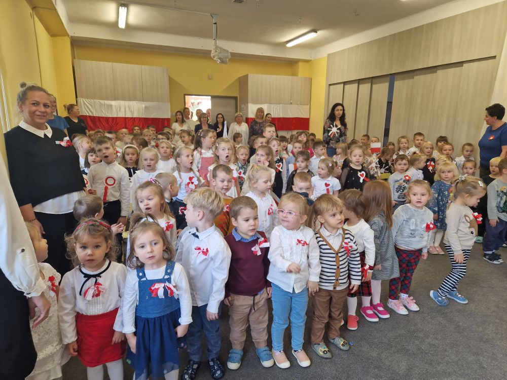 Dziś z okazji zbliżającego się święta zorganizowaliśmy w przedszkolu uroczyste spotkanie z udziałem wszystkich grup przedszkolnych. Dzieci były odświętnie ubrane, każde z przypiętym okolicznościowym kotylionem.