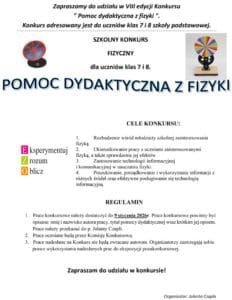 Szkolny Konkurs Fizyczny przez Piotrek · 30 listopada 2025 · odsłon: 14 Zapraszamy do udziału w VIII edycji Konkursu „Pomoc dydaktyczna z fizyki”. Konkurs adresowany jest do uczniów klas 7 i 8 szkoły podstawowej. Udostępnij na Facebook Messenger