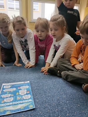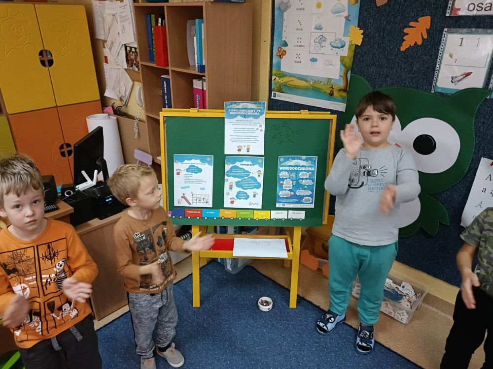 W listopadzie Przedszkolaki z Grupy V „Jeżyki” wzięły udział w akcji informacyjno – edukacyjnej pt.: ,,Wirusoochrona” zorganizowanej przez Wojewódzką Stację Sanitarno – Epidemiologiczną w Katowicach. Działania edukacyjne polegały na zdobyciu wiedzy z zakresu zdrowia i higieny. Przedszkolaki dowiedziały się gdzie mogą mieć styczność z wirusami oraz jak się przed nimi chronić. Zwieńczeniem zajęć było wykonanie przez Jeżyki pracy plastycznej.