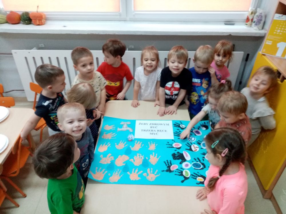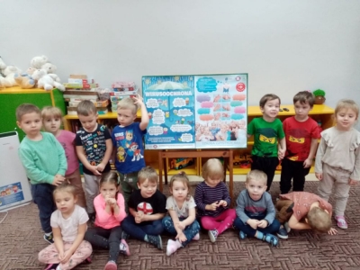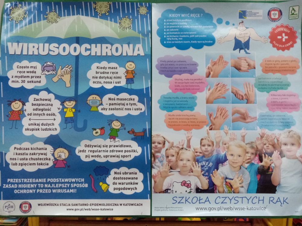 Wirusoochrona to wojewódzka akcja informacyjno – edukacyjna, której głównym celem jest uświadamianie dzieciom jak ważne jest przestrzeganie podstawowych zasad higieny – to najlepszy sposób ochrony przed bakteriami     i wirusami. Po raz pierwszy dzieci z grupy Misie uczestniczyły w tej akcji. Obejrzały film edukacyjny o wirusach i bakteriach, o zapobieganiu ich rozprzestrzenianiu. Dowiedziały się jak ważne jest dokładne mycie rąk – schemat prawidłowego mycia rąk przećwiczyły w łazience. Na koniec zajęć wspólnie wykonały plakat – „Żeby zdrowym być trzeba ręce myć”.