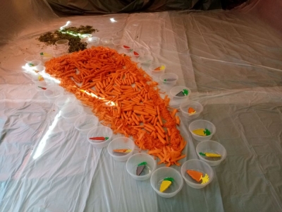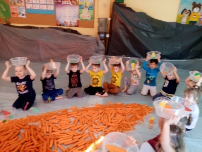 W dniu marchewki, który świętujemy 4 kwietnia dobry humor towarzyszył dzieciom już od rana. Gdy tylko przekroczyły progi przedszkola nie mogły doczekać się niespodzianki, która czekała na nich po śniadaniu. W sali czekało na nich marchewkowe pole ułożone w kształt marchewki. Przedszkolaki samodzielnie tarkowały marchewkę, robiły sałatkę, kosztowały tego pełnego witamin warzywa.