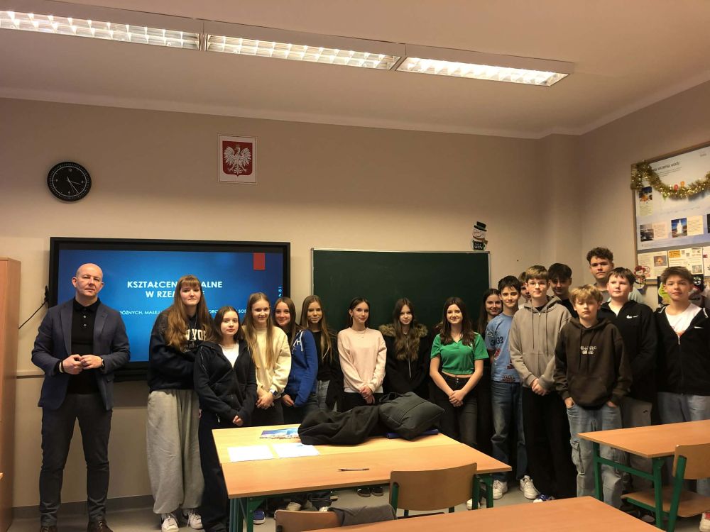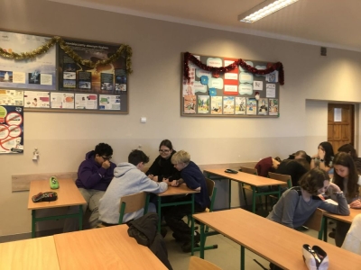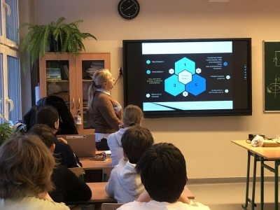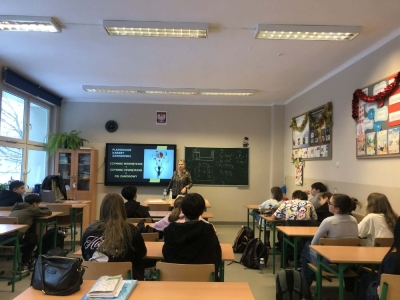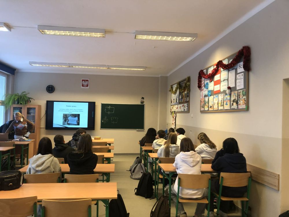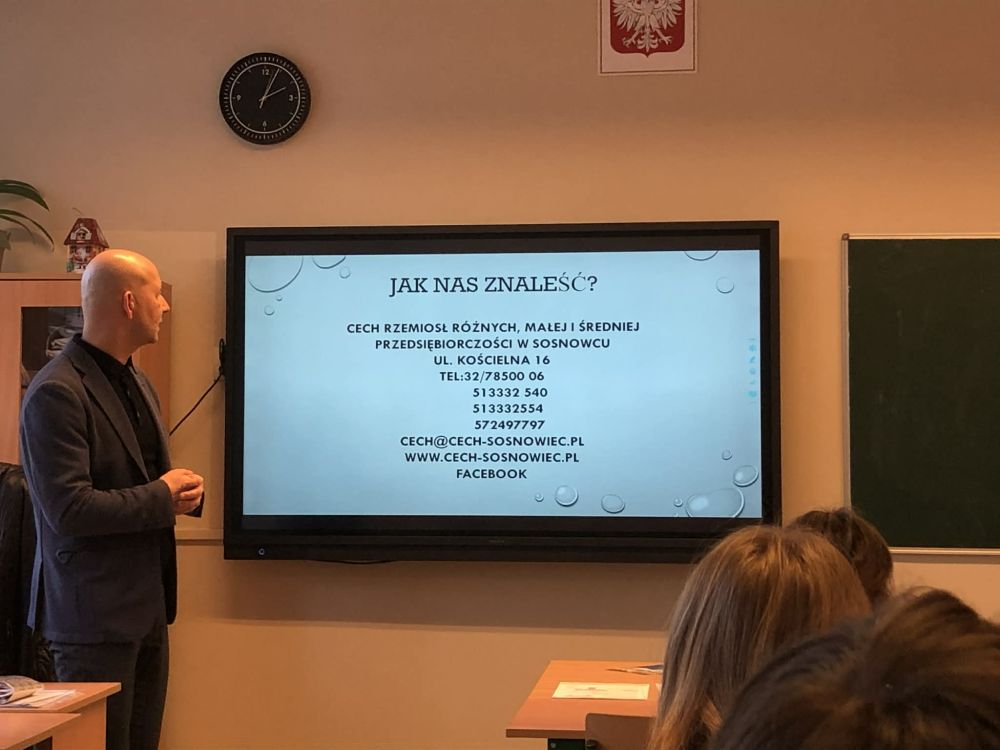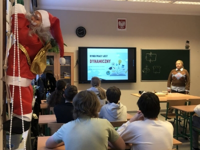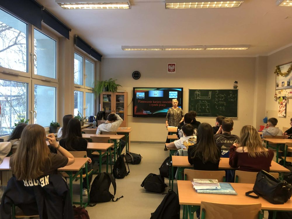 Uczniowie klas 7 uczestniczyli w styczniu i w grudniu w zajęciach zawodoznawczych, prowadzonych przez Panią Lucynę Huppert z Powiatowego Urzędu Pracy w Sosnowcu „ Planowanie kariery i rynek pracy”, Panią Martę Wdówczyk z Poradni Psychologiczno- Pedagogicznej nr 2 w Sosnowcu „ Psychologiczne aspekty wyboru zawodu” oraz Pana Radosława Glanowskiego z Cechu Rzemiosł Różnych Małej i Średniej Przedsiębiorczości w Sosnowcu „ Od ucznia do mistrza – kształcenie dualne w rzemiośle”.